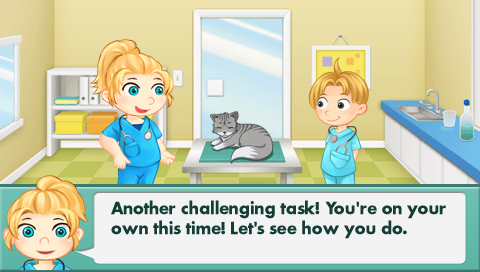 Welcome to the mountainside vet clinic. The veterinarian will help teach you different ways to take care of pets, such as grooming, cleaning teeth, getting rid of fleas, and fixing hurt legs. Complete the training levels and become a super veterinarian!