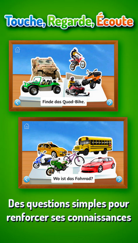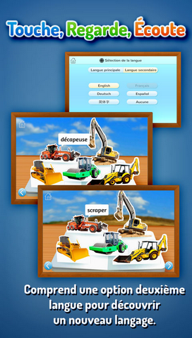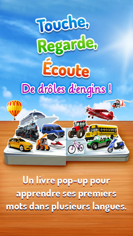 De drôles d'engins ! se présente comme un vrai livre ; il est donc facile à utiliser. Chaque page commence par une rime joyeuse alors que des images gaies et colorées apparaissent comme par magie dans chaque scène en 3D. Quand votre enfant appuie sur une image, il voit et entend le mot qui lui est associé. Cela en fait un excellent outil d'apprentissage de nouveaux mots qui renforce également ceux qu'il connaît déjà. Avec l'option de deuxième langue, il peut aussi découvrir d'autres langues, dont l'anglais, l'allemand, l'espagnol et le chinois.