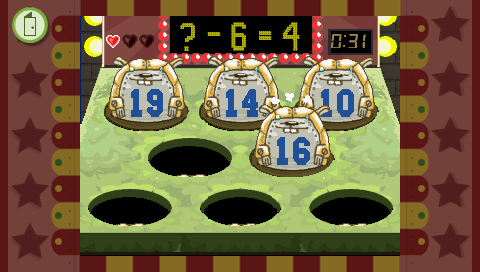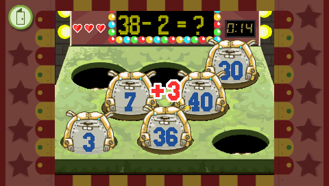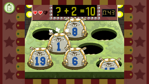 Let's play a fun carnival game! The robot groundhogs keep popping up from their holes. Tap the robot with the number that answers the question to earn points. You're great at math!