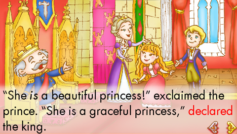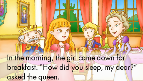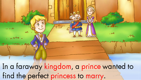 A prince wants to find a true princess to marry so he looks throughout the kingdom to find her. But there is no true princess to be found. Then, one dark and stormy night, a girl knocks on the castle door. She tells the king, queen, and prince that she is a true princess. But is she really? The wise queen knows a way she can find out, and it involves a tiny little pea. You can read along and click on the screen for fun sound effects and character names. There is also a story dictionary where you can see pictures and hear detailed definitions for challenging words. Have fun reading and learning with the Princess and the Pea!