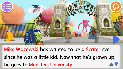 The Scare Games are the biggest event of the year at Monsters University. Mike and the other Oozma Kappas need to win, or Mike and Sulley will get expelled! Read their story in the e-book, or help Mike and Sulley train for the Scare Games in the learning games.